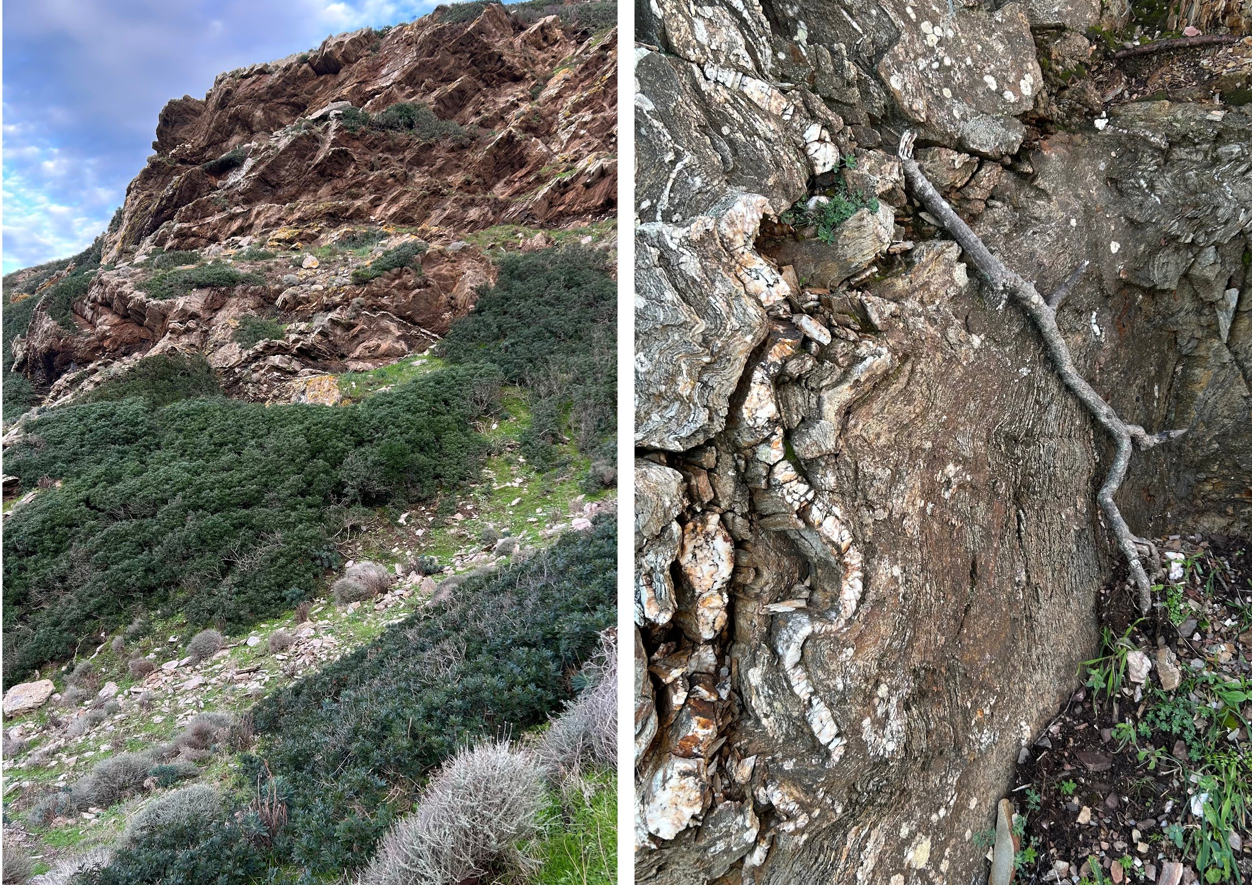 Cette roche est une roche métamorphique appelée métarénite. Elle est issue de matériaux d’origine sédimentaire, transformés en profondeur sous l’effet de fortes contraintes et pressions. Elle appartient à l’ancien socle géologique de la Sardaigne et ne s’est pas formée en surface.