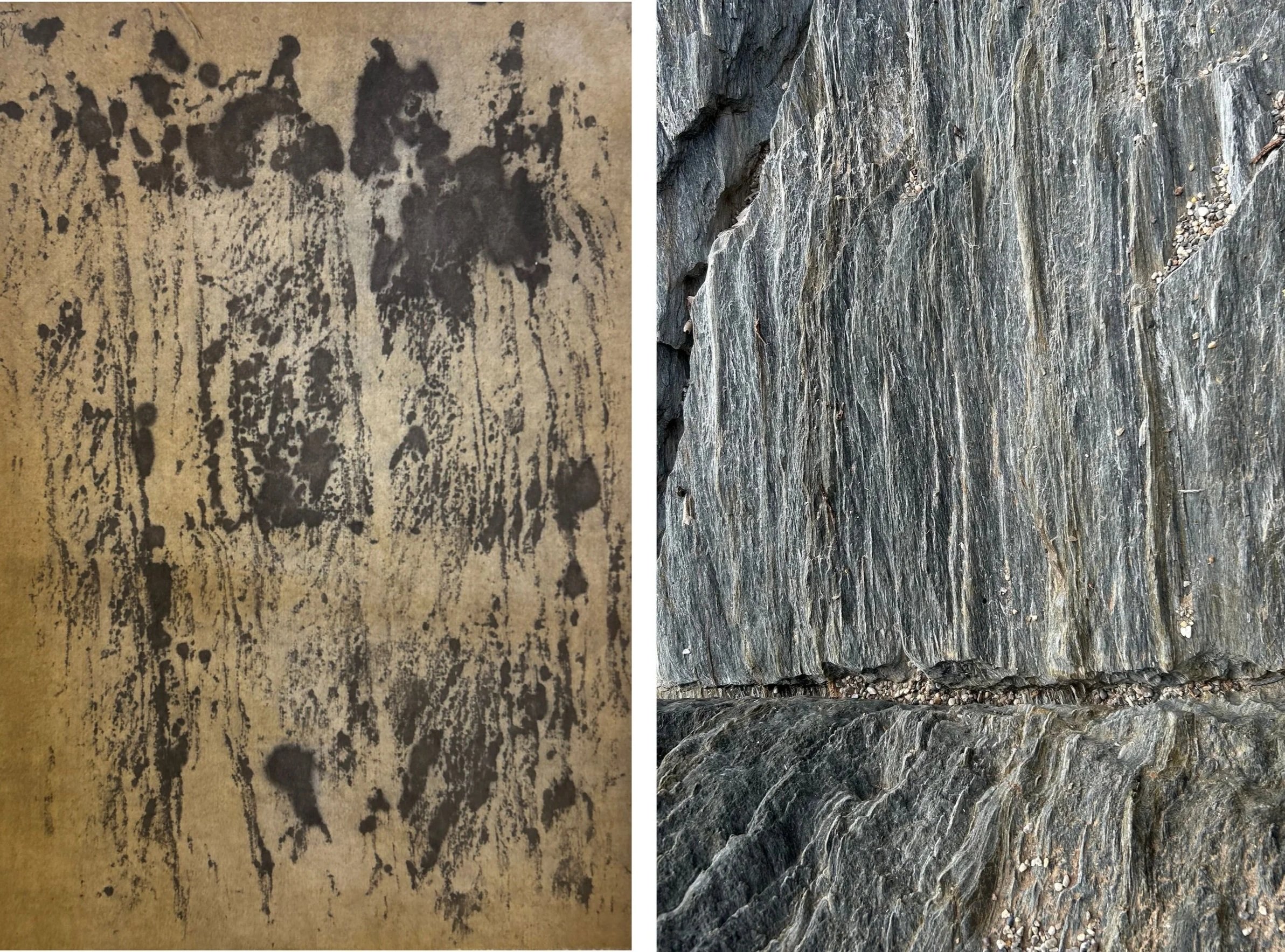 À Argentira, les roches observées présentent un aspect feuilleté, composé de plaques successives issues de sédiments accumulés sur des millions d’années. Ces roches, à l’origine sédimentaires, ont ensuite été transformées par les mouvements tectoniques en roches métamorphiques. Une roche métamorphique est une roche qui a été profondément transformée à l’état solide par des variations intenses de température, de pression et/ou de fluides, créant de nouveaux minéraux et une nouvelle texture.
